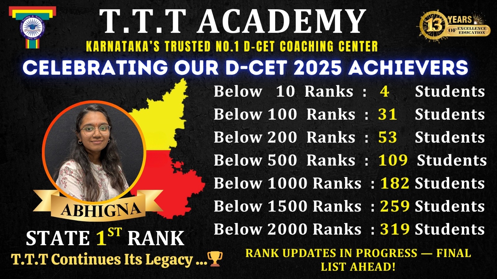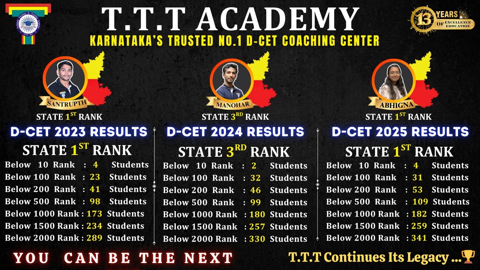 At TTT Academy, results speak louder than words. Every year, our students consistently secure top ranks in DCET and achieve outstanding performance across all competitive exams. This section highlights the achievements of our past batches and showcases the milestones we are proud of.